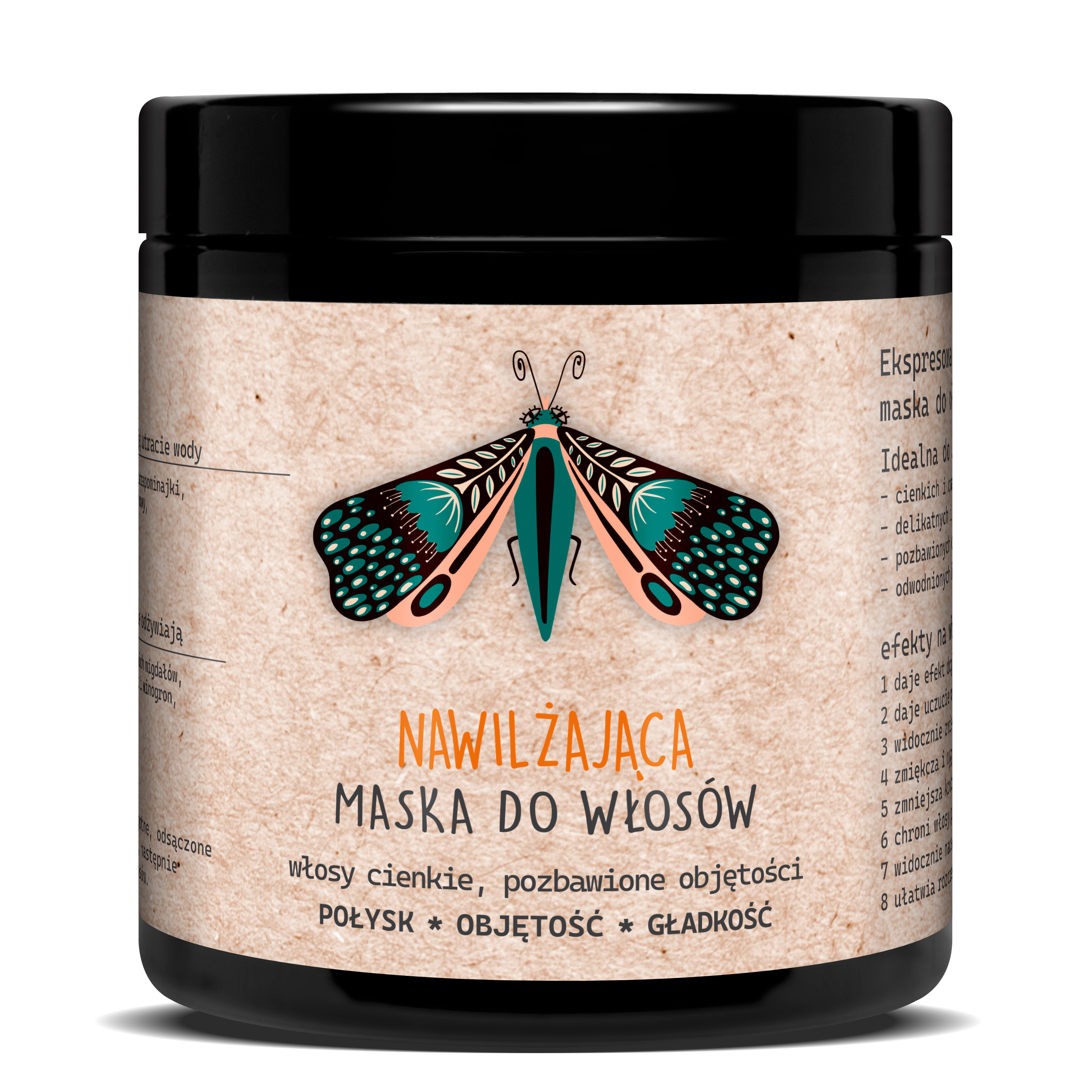 I am an EH mask (emollient-humectant), which means I contain emollients and humectants. Humectants that moisturize and prevent water loss are forget-me-not extract, hyaluronic acid and D-panthenol. The task of emollients is to intensively nourish the hair – this is done by oils: sweet almond, plum and grape seed, and shea butter.