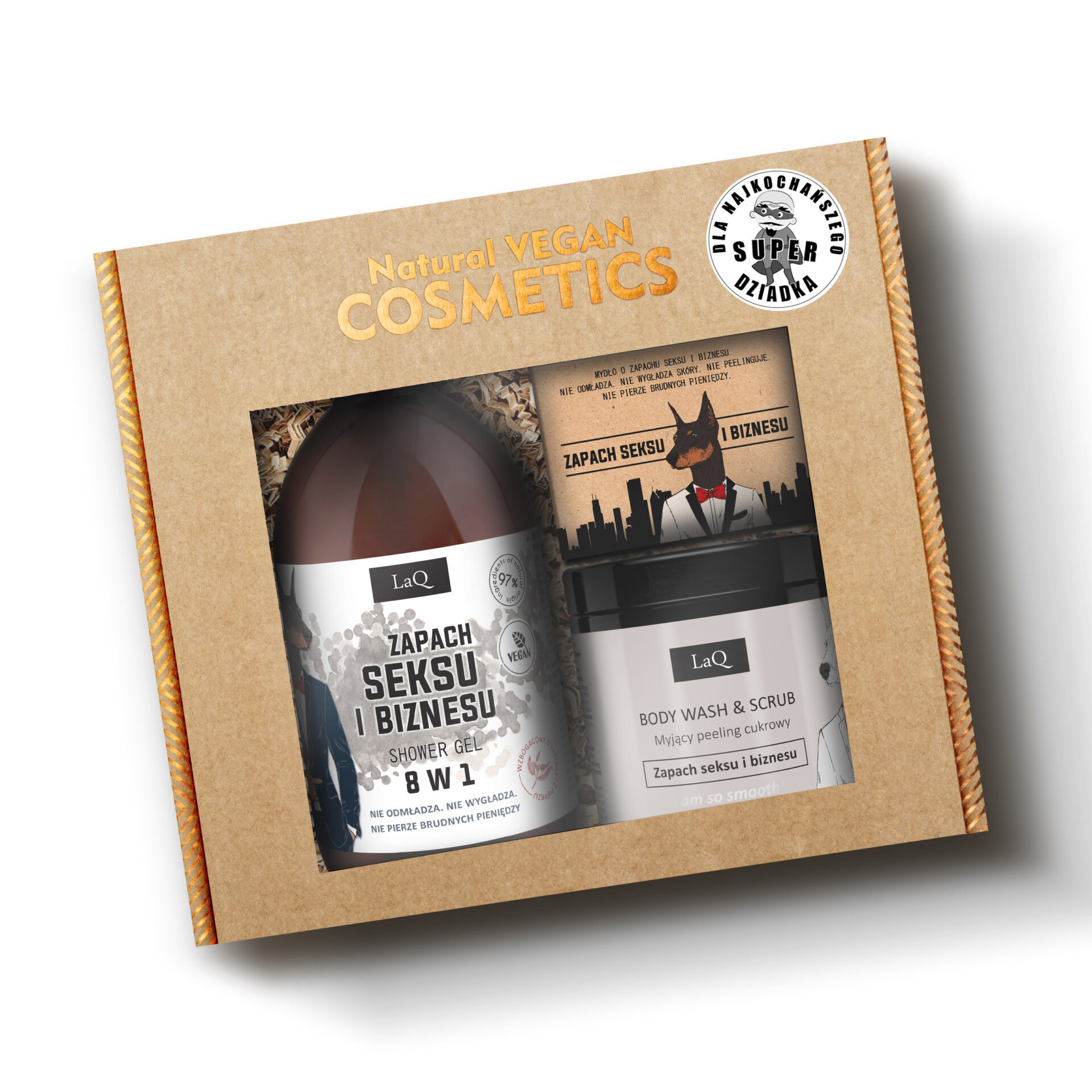 Oto ja, czyli wegański zestaw kosmetyków naturalnych dla mężczyzny, składający się z żelu pod prysznic, peelingu myjącego oraz mydła w kostce. Ktoś kiedyś powiedział o SEKS I BIZNESie “najlepszy” i jak dotąd tego nie odszczekał. Dobry nos wyczuje w nim męskie perfumy z nutą kardamonu i czarnego pieprzu. Seria ta jest idealna dla tych, którzy lubią dobry seks i udany biznes, jak również udany seks i dobry biznes. Receptura żelu pod prysznic bazuje na delikatnych substancjach myjących. Zawiera on nawilżającą glicerynę, a także ekstrakt z nasion kardamonu, mocznik oraz niacynamid. Z kolei cukrowy peeling myjący skutecznie oczyści Twoją skórę i usunie z niej martwy naskórek. Mydło w kostce natomiast umyje Cię łagodnie, nawet jeśli Twoja skóra jest delikatna i wrażliwa.