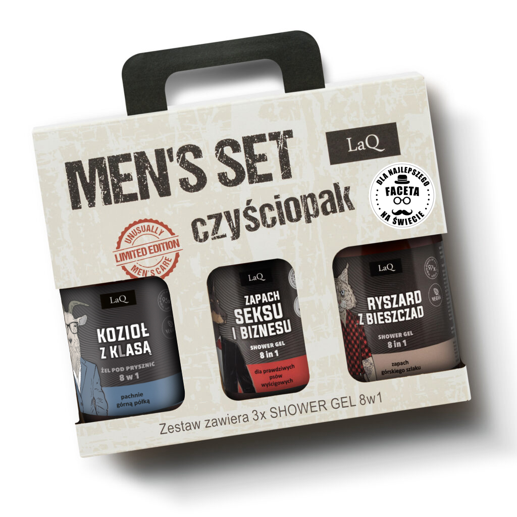 Co jest lepsze na prezent niż pół litra? półtora litra! szukasz prezentu dla faceta na urodziny? A może interesuje cię pomysł na niebanalny prezent dla kumpla na imieniny? Upominek na dzień chłopaka, podarunek na święta? Jesteś we właściwym miejscu, bowiem na prezent dla mężczyzny nadaję się idealnie! W szczególności dlatego, że jestem zapakowany w efektowne pudełko prezentowe z okienkami i wygodnym uchwytem. Poza tym, z uwagi na różnorodność zapachową i zabawne etykiety mogę śmiało zapewnić cię, że szaleństwo zmysłów i zadowolenie obdarowanego masz murowane!