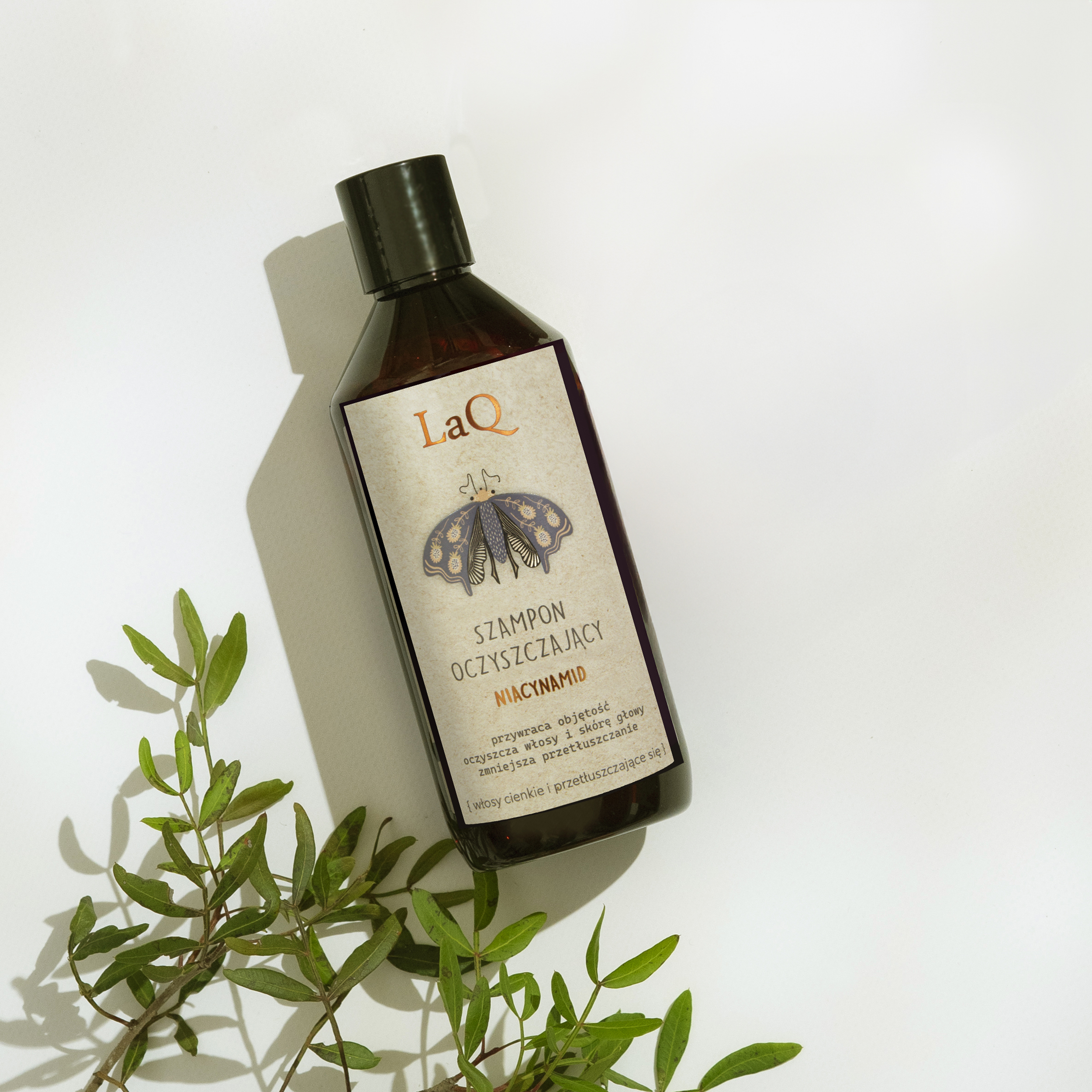 Poznaj naturalny szampon oczyszczający z niacynamidem, pielęgnujący włosy cienkie i przetłuszczające się. Jego receptura bazuje na łagodnych substancjach myjących pochodzenia roślinnego, a pH jest neutralne dla Twojej skóry.