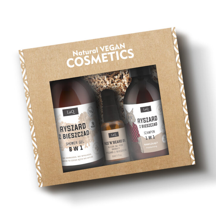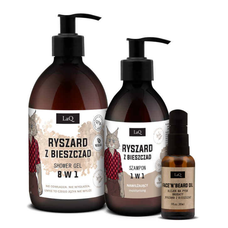 Oto ja, czyli wegański zestaw kosmetyków naturalnych dla mężczyzny, składający się z żelu pod prysznic, szamponu do włosów oraz olejku po goleniu i do brody. Ryszard z Bieszczad ma oryginalny zapach górskiego szlaku, który przenika się z ekskluzywnymi męskimi perfumami. Seria ta jest idealna dla facetów dzikich i sprytnych, którzy lubią chodzić własnymi ścieżkami. Receptura żelu pod prysznic bazuje na delikatnych substancjach myjących. Zawiera on nawilżającą glicerynę, a także wyciąg z liści tytoniu szlachetnego, mocznik oraz witaminę B3 (niacynamid). Z kolei szampon o działaniu nawilżającym zawiera m.in. pantenol, niacynamid, mocznik oraz ekstrakty roślinne. Dzięki nim łagodnie, ale i skutecznie oczyszcza włosy, dodając im zdrowego połysku. Natomiast olej do brody i po goleniu pomoże Ci zadbać o skórę twarzy, nawilżając ją i łagodząc ewentualne podrażnienia. Olejek nawilży też włosy Twojej brody, nada im zdrowy i lśniący wygląd oraz ułatwi ich rozczesywanie.