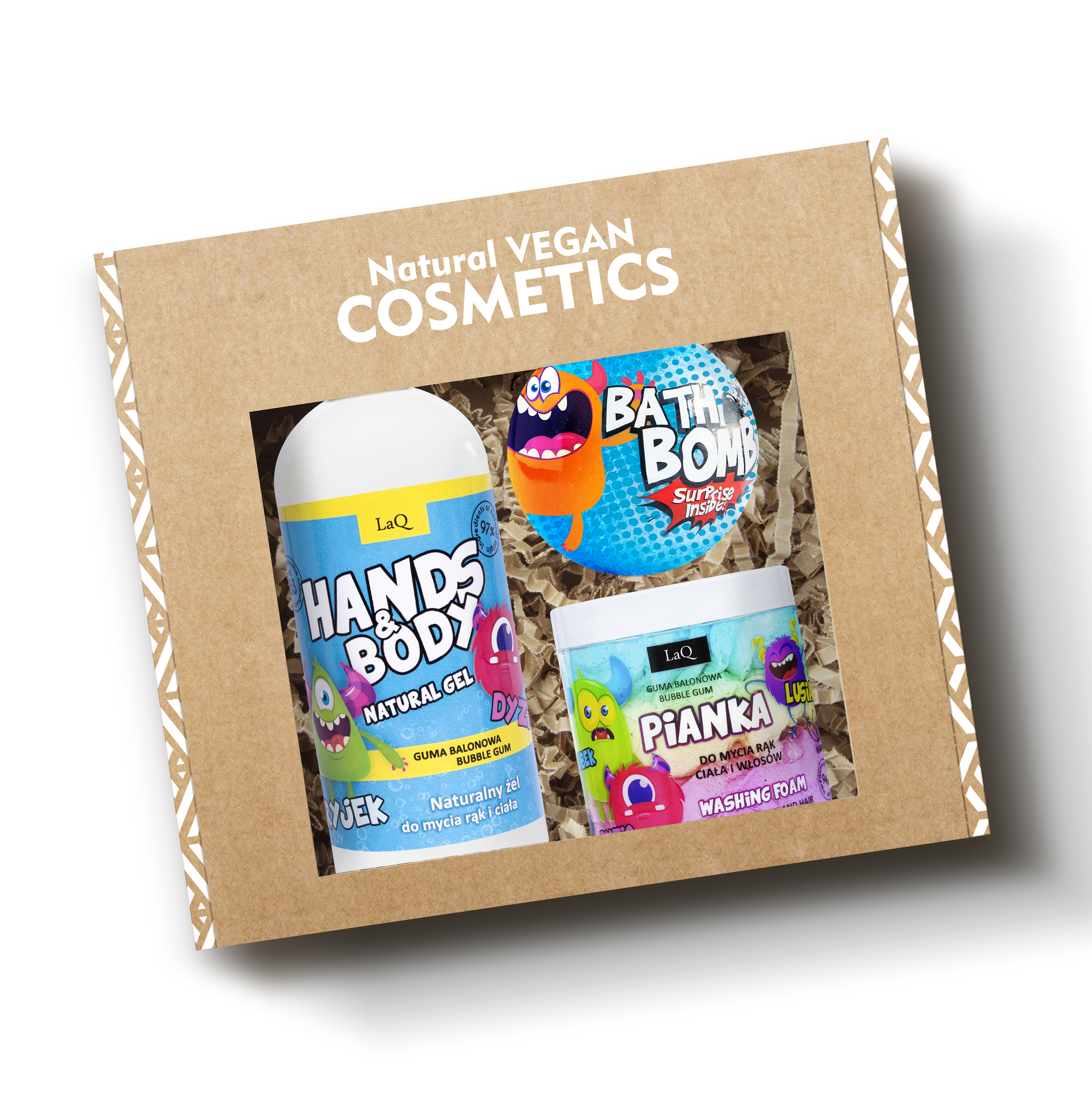 Oto ja, czyli wegański zestaw kosmetyków naturalnych dla dziecka, składający się z żelu do mycia, 3-kolorowej pianki do mycia oraz musującej kuli do kąpieli. Seria ta ma odlotowyzapach gumy balonowej oraz marakui. Stworzyliśmy ją specjalnie dla dzieci, z myślą o ich delikatnej skórze i miłości do kolorów. Żel przeznaczony jest do mycia ciała, włosów i rąk. Jego receptura bazuje na łagodnych substancjach myjących, zawiera również kompleks składników nawilżająco-odżywczych. Natomiast w niebiańsko lekkiej 3-kolorowej piance do kąpieli znajdziesz m.in. nawilżający ekstrakt z ryżu, masło shea i olej ze słodkich migdałów. Ponadto pianka barwi wodę na piękne kolory! Z kolei kula do kąpieli ma żywy niebieski kolor, który sprawia, że wanna zamienia się w morze. Z tymi produktami każdą kąpiel zamienisz w relaksującą i pachnącą zabawę!