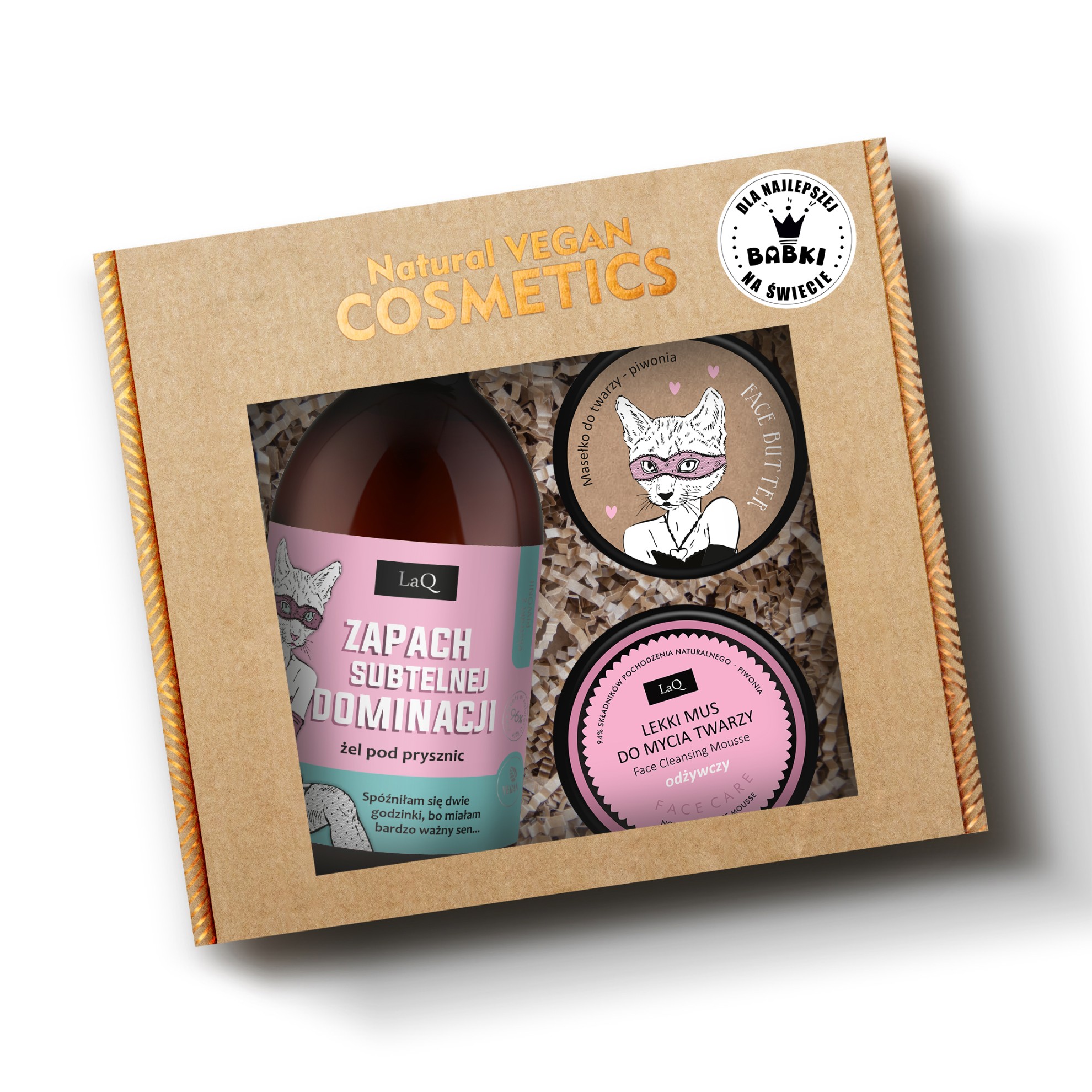 Oto ja, czyli wegański zestaw kosmetyków naturalnych dla kobiety, składający się z żelu pod prysznic, musu do mycia twarzy oraz masełka do twarzy. Ta kultowa już seria pachnie ekskluzywnie i zmysłowo – rozpoznasz w niej uwodzicielską piwonię. Powstała ona dla kobiet silnych i zdecydowanych, które znają swoją wartość i potrafią wykorzystać swoje atuty. Receptura żelu pod prysznic oparta jest na łagodnych substancjach myjących. Zawiera on też mnóstwo wspaniałych roślinnych ekstraktów oraz unikalny kompleks składników nawilżających. Natomiast mus do mycia twarzy o konsystencji lekkiej jak chmurka pianki świetnie oczyszcza twarz, jednakże nie zaburza jej naturalnego pH. Z kolei wielozadaniowe masło do twarzy o niezwykle odżywczej formule kryje w sobie bogactwo regenerujących składników, między innymi masło shea i witaminę E. Sensualny zapach wszystkich tych kosmetyków sprawi, że Twoje zmysły oszaleją z zachwytu, a Ty oczywiście razem z nimi!