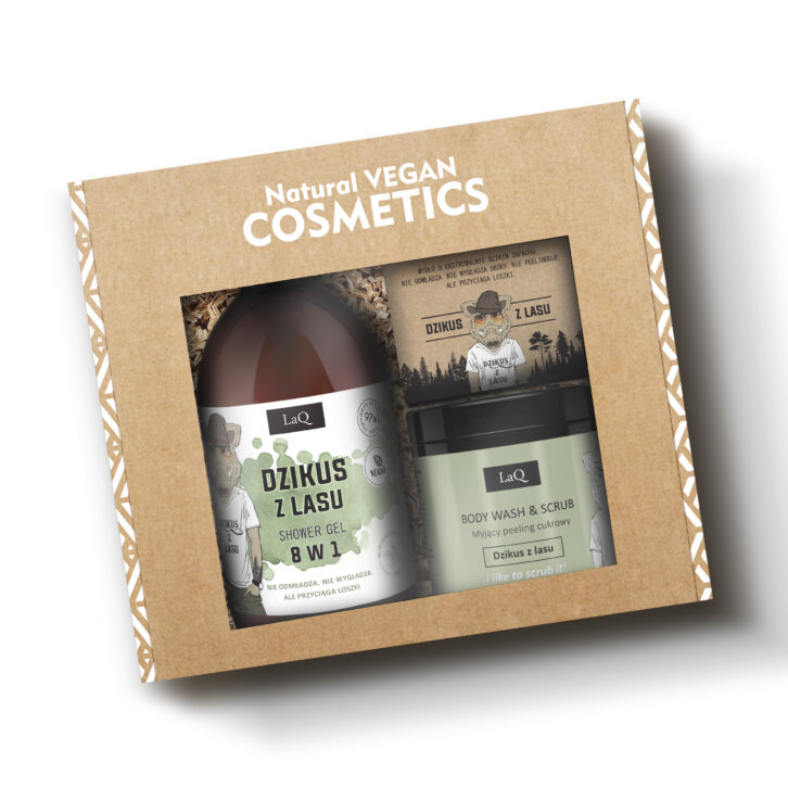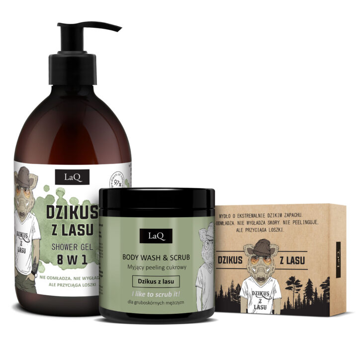 Oto ja, czyli wegański zestaw kosmetyków naturalnych dla mężczyzny, składający się z żelu pod prysznic, peelingu myjącego oraz mydła w kostce. Legendarny Dzikus z Lasu ma oryginalny zapach walki o szyszki, który przenika się z ekskluzywnymi męskimi perfumami. Seria ta jest idealna dla ekstremalnego dzika, ale także dla eksperta, ekscentryka i ekspata, jak również dla ekstrawertyka i eksperymentatora. Receptura żelu pod prysznic bazuje na delikatnych substancjach myjących. Zawiera on nawilżającą glicerynę, a także kojący ekstrakt z kory dębu bezszypułkowego. Z kolei cukrowy peeling myjący skutecznie oczyści Twoją skórę i usunie z niej martwy naskórek. Mydło w kostce natomiast umyje Cię łagodnie, nawet jeśli Twoja skóra jest delikatna i wrażliwa.