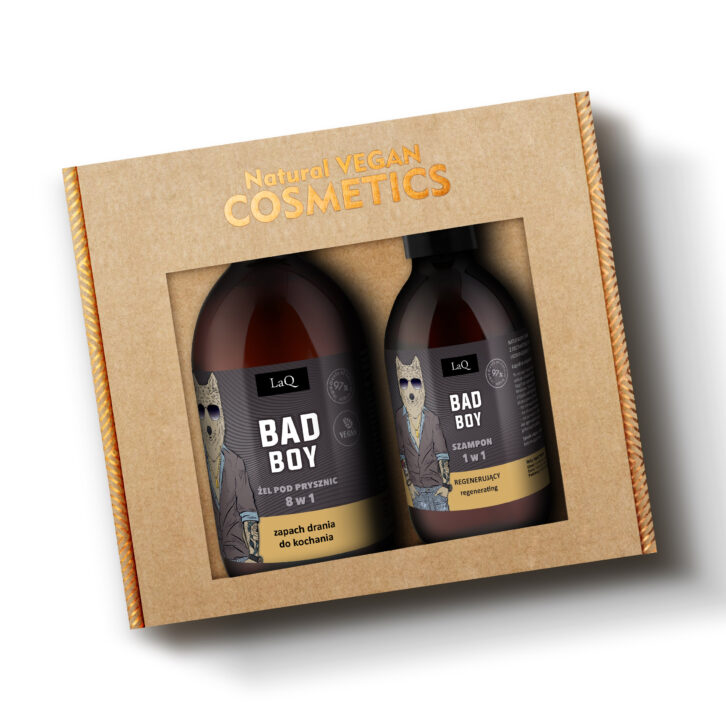 Oto ja, czyli wegański zestaw kosmetyków naturalnych dla mężczyzny, składający się z żelu pod prysznic oraz szamponu do włosów. Bad Boy to seria o zapachu drania (ale takiego do kochania), który to pachnie ekskluzywnymi męskimi perfumami. Ciągnie go czasem do lasu, z którego wraca głodny jak wilk i brudny jak… jak to facet. Więc kiedy idzie się wreszcie umyć, nie wywołuj wilka z łazienki. Receptury żelu i szamponu bazują na delikatnych substancjach myjących. Zawierają one również nawilżającą glicerynę, a także ekstrakt z liści tytoniu szlachetnego oraz kompleks dobroczynnych aminokwasów (arginina, alanina, seryna, walina, prolina i treonina).