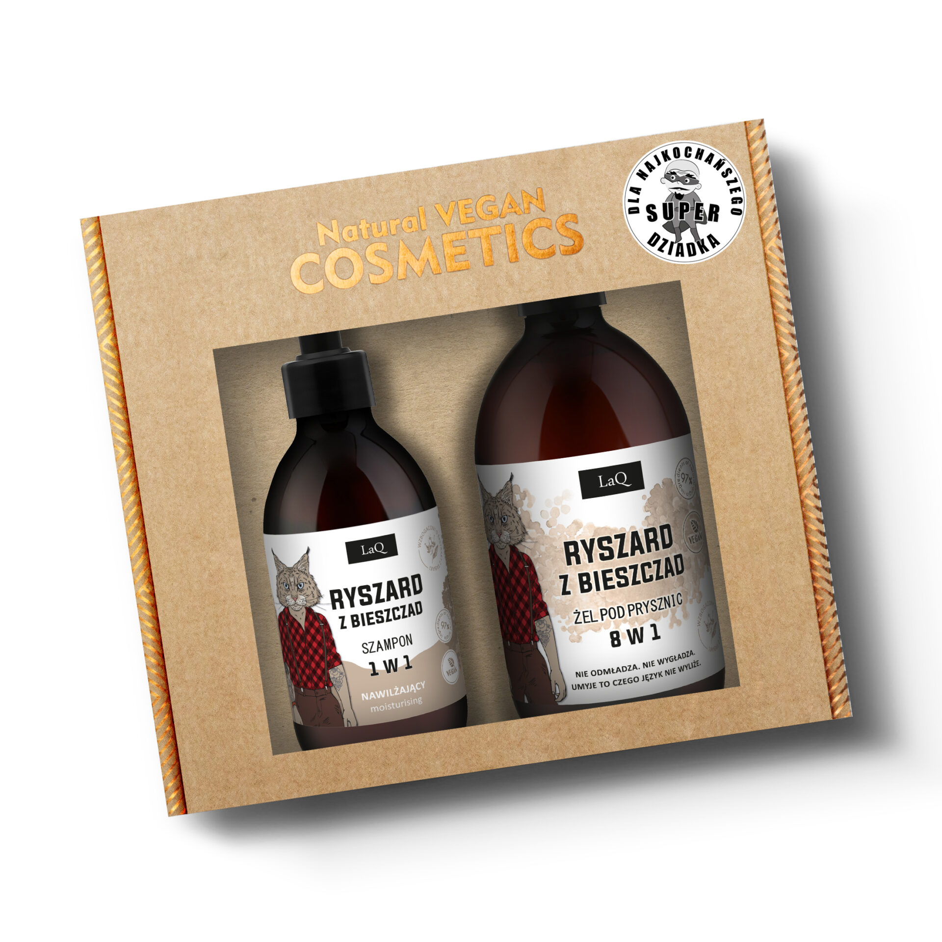 Oto ja, czyli wegański zestaw kosmetyków naturalnych dla mężczyzny, składający się z żelu pod prysznic oraz szamponu do włosów. Ryszard z Bieszczad ma oryginalny zapach górskiego szlaku, który przenika się z ekskluzywnymi męskimi perfumami. Seria ta jest idealna dla facetów dzikich i sprytnych, którzy lubią chodzić własnymi ścieżkami. Receptura żelu pod prysznic bazuje na delikatnych substancjach myjących. Zawiera on nawilżającą glicerynę, a także wyciąg z liści tytoniu szlachetnego, mocznik oraz witaminę B3 (niacynamid). Z kolei szampon o działaniu nawilżającym zawiera m.in. pantenol, niacynamid, mocznik oraz ekstrakty roślinne. Dzięki nim łagodnie, ale i skutecznie oczyszcza włosy, dodając im zdrowego połysku.