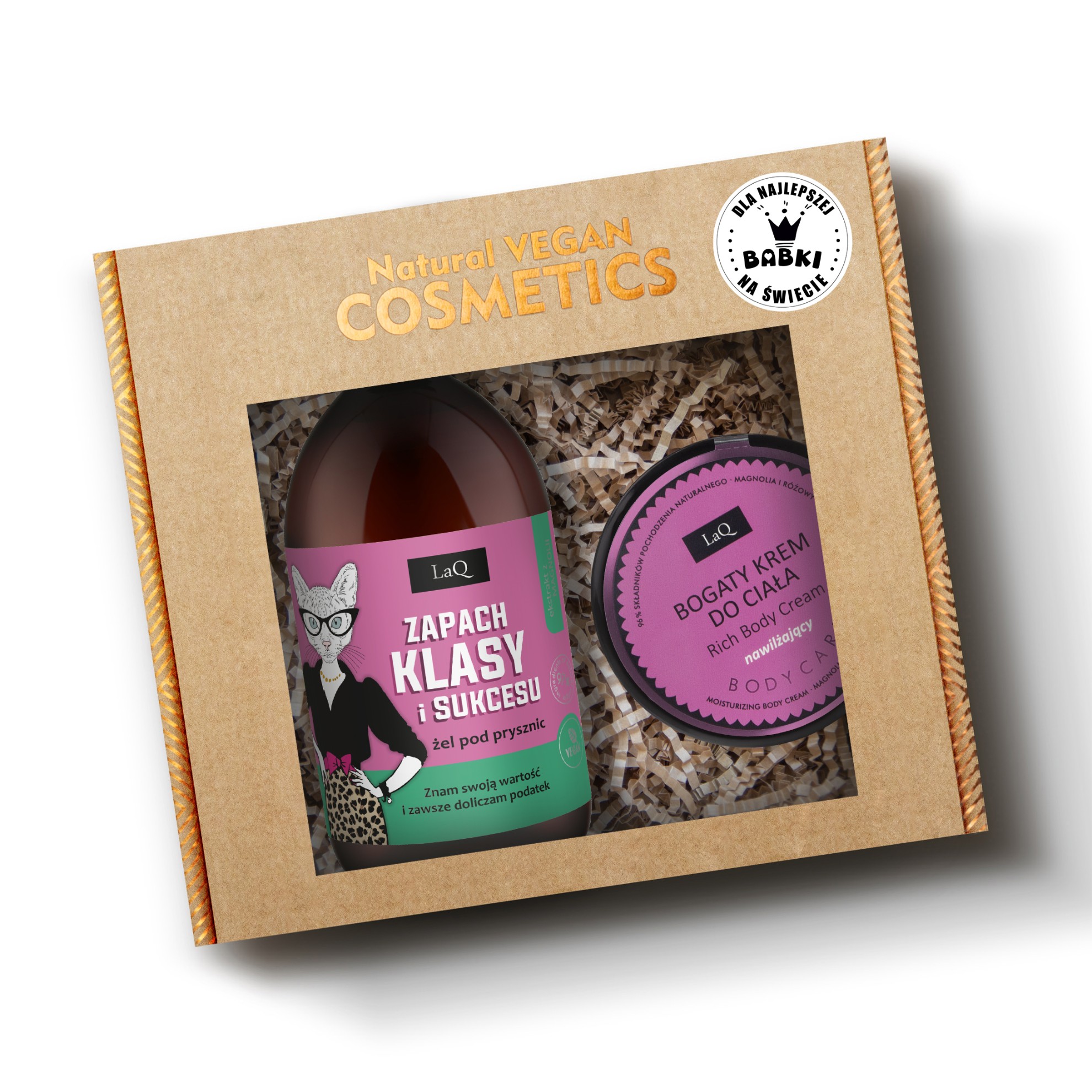 Oto ja, czyli wegański zestaw kosmetyków naturalnych dla kobiety, składający się z żelu pod prysznic i kremu do ciała. Damski żel pod prysznic pochodzi z serii o intrygującym zapachu ekskluzywnych perfum ze zmysłowymi nutami magnolii i różowego pieprzu. Żel jest idealny dla kobiet pewnych siebie i charyzmatycznych, które za dnia intrygują słodką tajemnicą, a nocami oczarowują nieokiełznaną zmysłowością. Z kolei bogaty krem do pielęgnacji ciała dla kobiet wykazuje działanie intensywnie nawilżające, a ponadto niezwykle przyjemnie rozprowadza się na skórze i szybko się wchłania, nie pozostawiając na niej tłustej warstwy. Zatem ogólnie mówiąc, jestem prawdziwym Żel De La Krem wszystkich zestawów!
